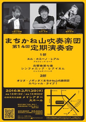 この度まちかね山吹奏楽団では、大阪音楽大学講師 小野川昭博氏、米米CLUB等で活躍されておられる、サクソフォン奏者の織田浩司(オリタ・ノボッタ)氏、パーカッション奏者の玉木正昭氏をお迎えして、下記のとおり第14回定期演奏会を開催させていただくこととなりましたので、この場をお借りしてご案内させていただきます。